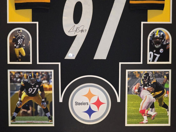 Custom Framed Cam Heyward signed Pittsburgh Steelers style custom jersey.Beckett HologramThe authentication is from Beckett. This signature is WITNESSED by a representative of Beckett! 100% AUTHENTIC!!! The jersey has fully stitched numbers on the front and back. It is a great item and a must for all great sports fans!This item is professionally framed, it measures 32"x40" inside , 42"x34" outside , using UV protective Acrylic glass for safe keeping and safe transport, team color matting, black moulding and hanging hooks on the back. All additional items in frame seen in pictures included. 100% ready to hang in your fan cave.