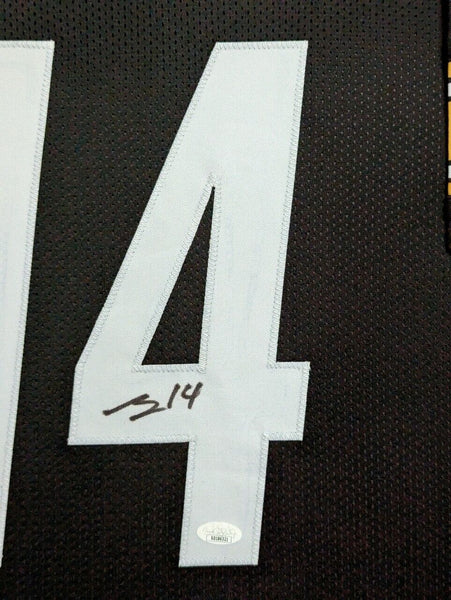 Custom Framed George Pickens hand signed Pittsburgh Steelers style custom jersey.JSA Certificate of AuthenticityThe authentication is from JSA. This signature is authenticated by a representative of JSA! 100% AUTHENTIC!!! The jersey has fully stitched numbers on the front and back. It is a great item and a must for all great sports fans!This item is professionally framed, it measures 32"x40" inside , 42"x34" outside , using UV protective Acrylic glass for safe keeping and safe transport, team color matting, black moulding and hanging hooks on the back. All additional items in frame seen in pictures included. 100% ready to hang in your fan cave.