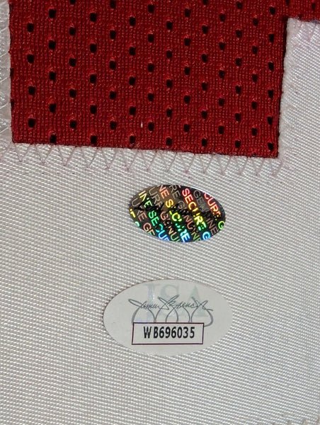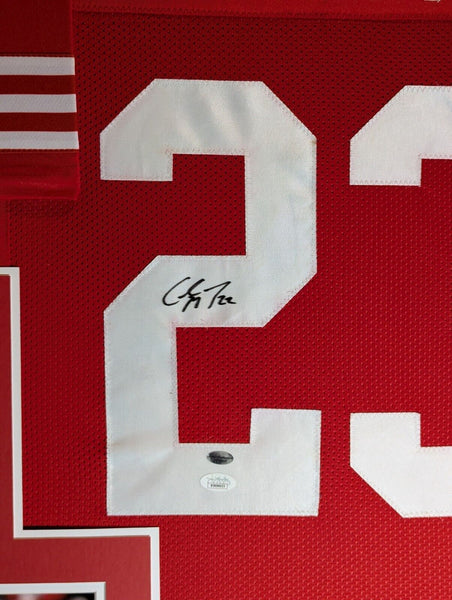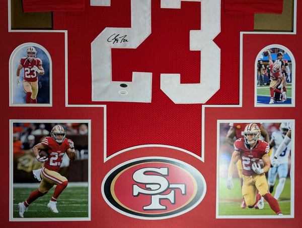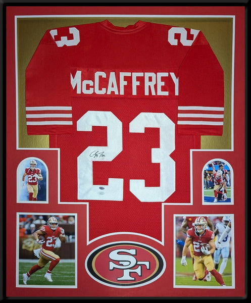 Custom Framed Christian McCaffrey hand signed San Francisco 49ers style custom jersey.JSA Hologram and COAThe authentication is from JSA. This signature is witness authenticated by a representative of JSA! 100% AUTHENTIC!!! The jersey has fully stitched numbers on the front and back. It is a great item and a must for all great sports fansThis item is professionally framed, it measures 32"x40" inside , 42"x34" outside , using UV protective Acrylic glass for safe keeping and safe transport, team color matting, black moulding and hanging hooks on the back. All additional items in frame seen in pictures included. 100% ready to hang in your fan cave.