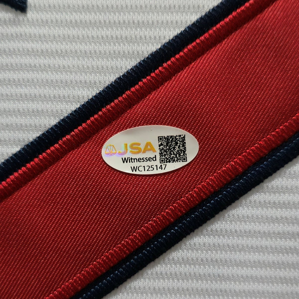 Custom Suede Mat Framed Roger Clemens hand signed Boston Red Sox Jersey.JSA COAThe authentication is from JSA. This signature is WITNESSED by a representative of PSA! 100% AUTHENTIC!!! The jersey has fully stitched numbers on the front and back. It is a great item and a must for all great sports fans!This item is professionally framed, it measures 32"x40" inside , 42"x34" outside , using UV protective Acrylic glass for safe keeping and safe transport, team color matting, black moulding and hanging hooks on the back. All additional items in frame seen in pictures included. 100% ready to hang in your fan cave.
