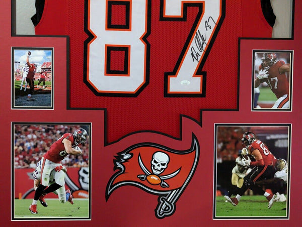 Custom Framed Rob Gronkowski Tampa Bay Buccaneers style custom jersey.JSA COAThe authentication is from JSA. This signature is authenticated by a representative of JSA! 100% AUTHENTIC!!! The jersey has fully stitched numbers on the front and back. It is a great item and a must for all great sports fans!This item is professionally framed, it measures 32"x40" inside , 42"x34" outside , using UV protective Acrylic glass for safe keeping and safe transport, team color matting, black moulding and hanging hooks on the back. All additional items in frame seen in pictures included. 100% ready to hang in your fan cave.