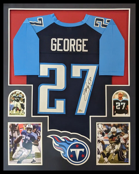 Custom Framed Eddie George hand signed Tennessee Titans style custom jersey.Beckett HologramThe authentication is from Beckett. This signature is WITNESSED by a representative of Beckett! 100% AUTHENTIC!!! The jersey has fully stitched numbers on the front and back. It is a great item and a must for all great sports fans!This item is professionally framed, it measures 32"x40" inside , 42"x34" outside , using UV protective Acrylic glass for safe keeping and safe transport, team color matting, black moulding and hanging hooks on the back. All additional items in frame seen in pictures included. 100% ready to hang in your fan cave.