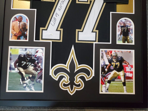 Custom Framed Willie Roaf hand signed inscribed "HOF 2012" New Orleans Saints style custom jersey.JSA Hologram and COA(#WPP605587)The authentication is from JSA. This signature is not authenticated by opinion but it is WITNESSED by a representative of JSA! 100% AUTHENTIC!!! The jersey has fully stitched numbers on the front and back. It is a great item and a must for all great sports fans!This item is professionally framed, it measures 32"x40" inside , 42"x34" outside , using UV protective Acrylic glass for safe keeping and safe transport, team color matting, black moulding and hanging hooks on the back. All additional items in frame seen in pictures included. 100% ready to hang in your fan cave.