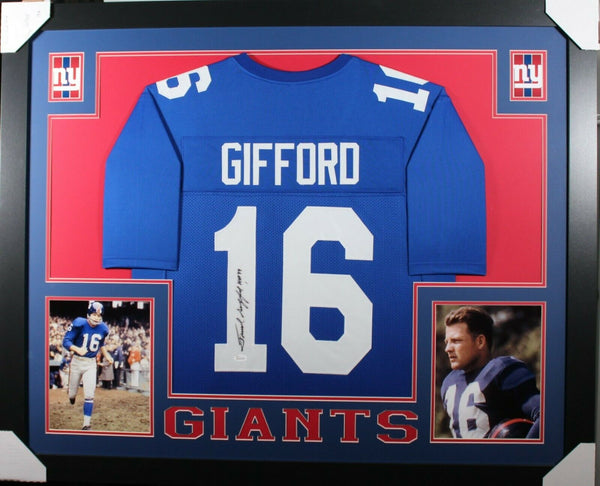 FRANK GIFFORD AUTOGRAPHED & PROFESSIONALLY FRAMED PRO-STYLE JERSEY(Occasionally our own stock pictures are used at times due to quantity of framing, all frames will look identical as the one pictured)THE FRAMED JERSEY MEASURES 35"x 44" & COMES WITH THE FOLLOWING:-UV Protected Acrylic-Triple Acid Free Team Colored Matting-2 High Quality 8"x10" Photos-Team LogoEvery framed autographed jersey is accompanied with a tamper-proof hologram on the signed part of the jersey from one of the main authenticators in the industry (JSA, Beckett, PSA, etc.) and can be verified on their corresponding websites to prove authenticity.