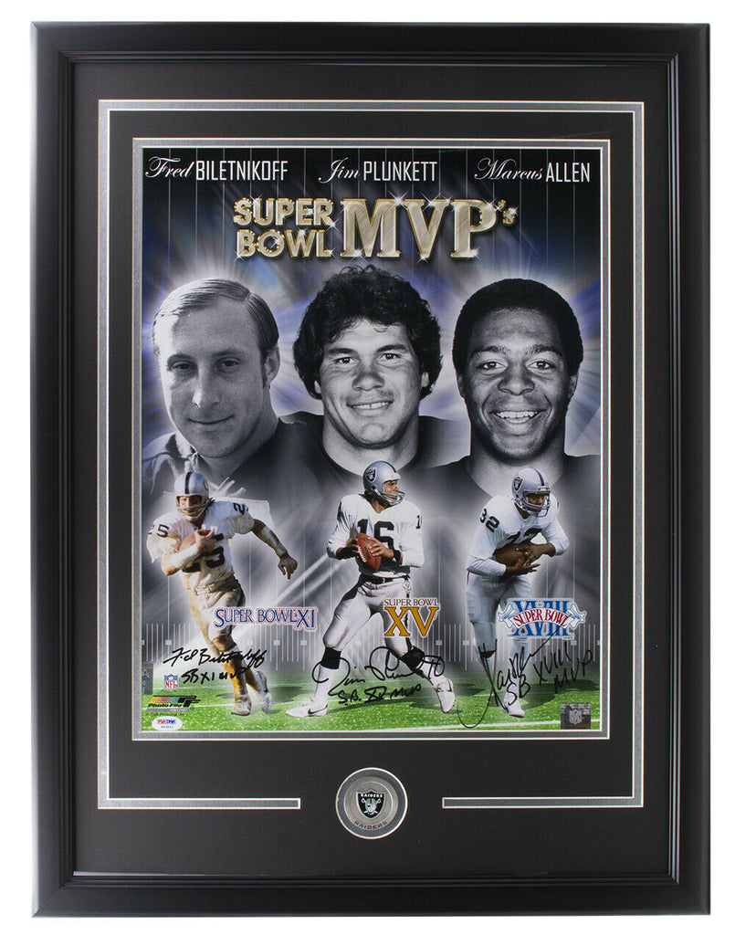 Featured is a Fred Biletnikoff, Jim Plunkett, and Marcus Allen signed framed 16x20 Super Bowl MVP's photo. This photo was hand signed by Fred Biletnikoff, Jim Plunkett, and Marcus Allen and authenticated by PSA/DNA authentication services. Included with the photo is a PSA/DNA hologram and certificate of authentication. This photo has been professionally framed and matted and measures approximately 22x27. SPECIFICATIONS Autographed By: Fred Biletnikoff Team: Oakland Raiders Sport: Football-NFL Authentication: Professional Sports Authenticator (PSA)