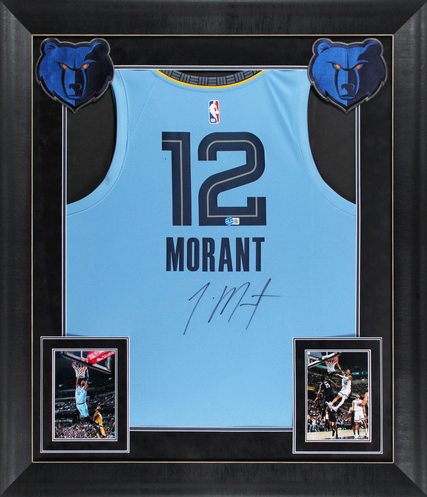This Autographed Light Blue Nike Swingman Framed Jersey has been Personally Signed by Ja Morant of the Memphis Grizzlies. This item is 100% Authentic to include a hologram by Beckett Authentication Services. This item will come with an affixed Beckett Authentication Services (BAS) authentication sticker, which includes a scannable QR code to verify authenticity. Please note that Beckett no longer provides serial-numbered COA cards, and the attached BAS sticker will serve as the complete authentication for this item. We have multiples of this same item. While the photographs are representative of this item, the size, placement and strength of the signature may vary. Each item is hand signed, therefore, each autograph is unique. This item has been professionally framed to overall dimensions of approximately 32 x 37 inches. This is a X-Large sized Framed Jersey. This jersey will be framed to order, it will take 3-4 days from purchase date for it to ship.
