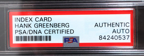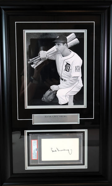 The product is an autographed index card featuring baseball player Hank Greenberg, with a photo framed and authenticated by Professional Sports Authenticator (PSA). The card is original and signed by Greenberg himself, making it a valuable collector's item for fans of the Detroit Tigers and baseball in general. This unique piece would make a great addition to any sports memorabilia collection, showcasing Greenberg's legendary status in the sport and the authenticity of the autograph through the PSA COA certification.Framed Size: 15x24