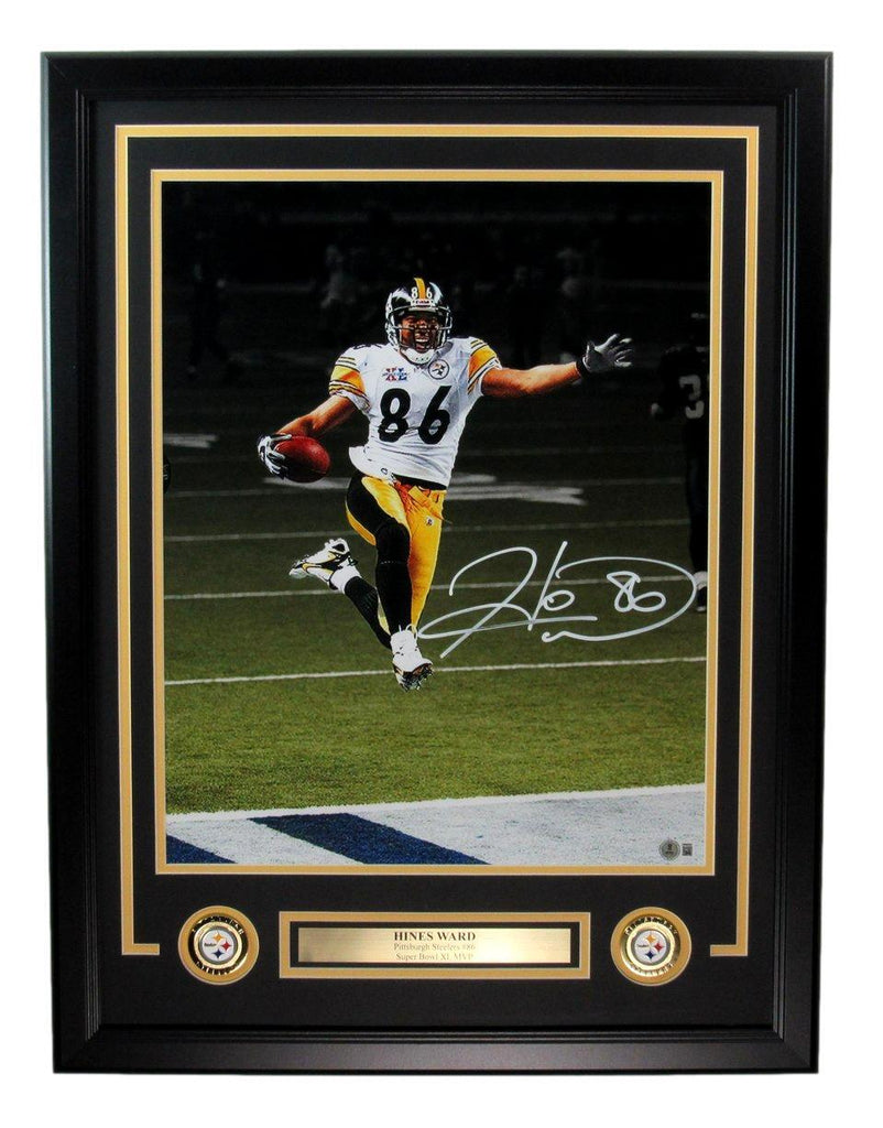 Hines Ward Signed/Autographed 16x20 Photo Pittsburgh Steelers Framed. The outer frame size is 26 inches x 22 inches. This photo is authenticated by BAS/Beckett and includes their tamper-proof hologram sticker.