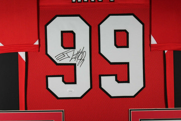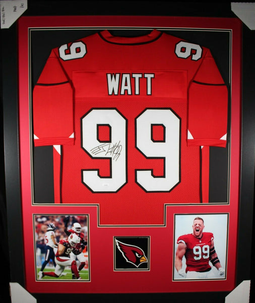 JJ WATT AUTOGRAPHED & PROFESSIONALLY FRAMED PRO-STYLE JERSEY(Occasionally our own stock pictures are used at times due to quantity of framing, all frames will look identical as the one pictured)THE FRAMED JERSEY MEASURES 35"x 44" & COMES WITH THE FOLLOWING:-UV Protected Acrylic-Triple Acid Free Team Colored Matting-2 High Quality 8"x10" Photos-Team LogoEvery framed autographed jersey is accompanied with a tamper-proof hologram on the signed part of the jersey from one of the main authenticators in the industry (JSA, Beckett, PSA, etc.) and can be verified on their corresponding websites to prove authenticity.