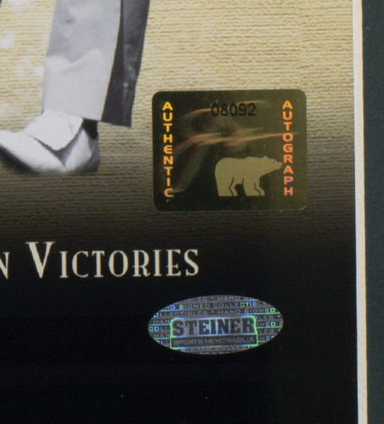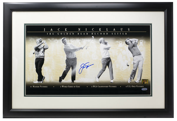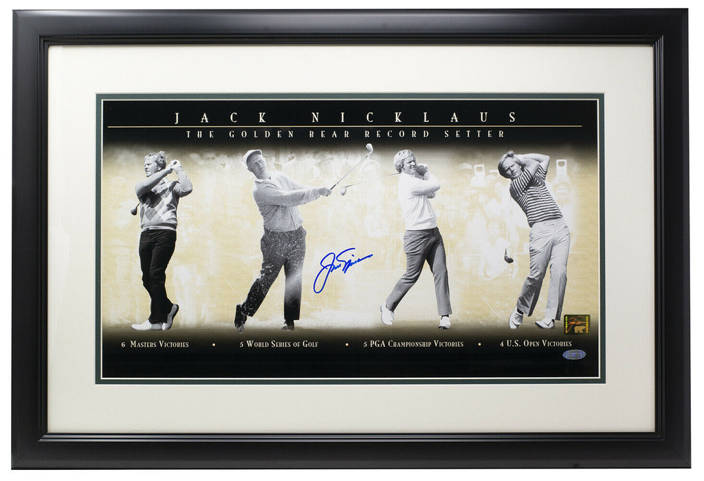 Featured is a Jack Nicklaus signed framed 19x11 golf collage photo. This photo was hand signed by Jack Nicklaus and authenticated by Steiner authentication services. Included with the photo is a Steiner hologram and certificate of authentication. This item would make a great addition to any sports memorabilia collection!. SPECIFICATIONS Autographed By: Jack Nicklaus Team: Sport: Golf-PGA Authentication: Beckett Grading Services