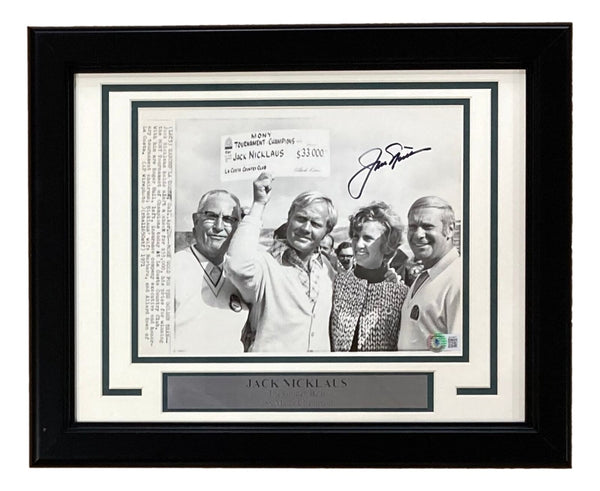 Featured is a Jack Nicklaus signed 8x10 PGA golf photo. This photo has been hand signed by Nicklaus and comes with the Beckett hologram and letter of authenticity. This photo has been professionally framed and matted and is approximately 11x14. This photo would make a great addition to any sports memorabilia collection! SPECIFICATIONS Autographed By: Team: Sport: Golf-PGA Authentication: Beckett Grading Services