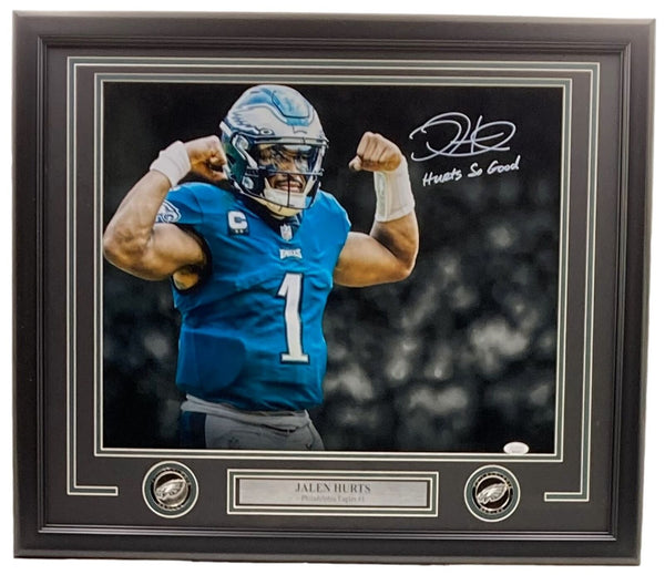Featured is a Jalen Hurts signed 16x20 Philadelphia Eagles photo. This photo was hand signed by Hurts and inscribed, "Hurts So Good". This photo comes with the JSA witnessed hologram and certificate of authentication. This photo has been professionally framed and matted and is approximately 22x27. This item would make a great addition to any sports memorabilia collection. SPECIFICATIONS Autographed By: Jalen Hurts Team: Philadelphia Eagles Sport: Football Authentication: James Spence Authentication (JSA)
