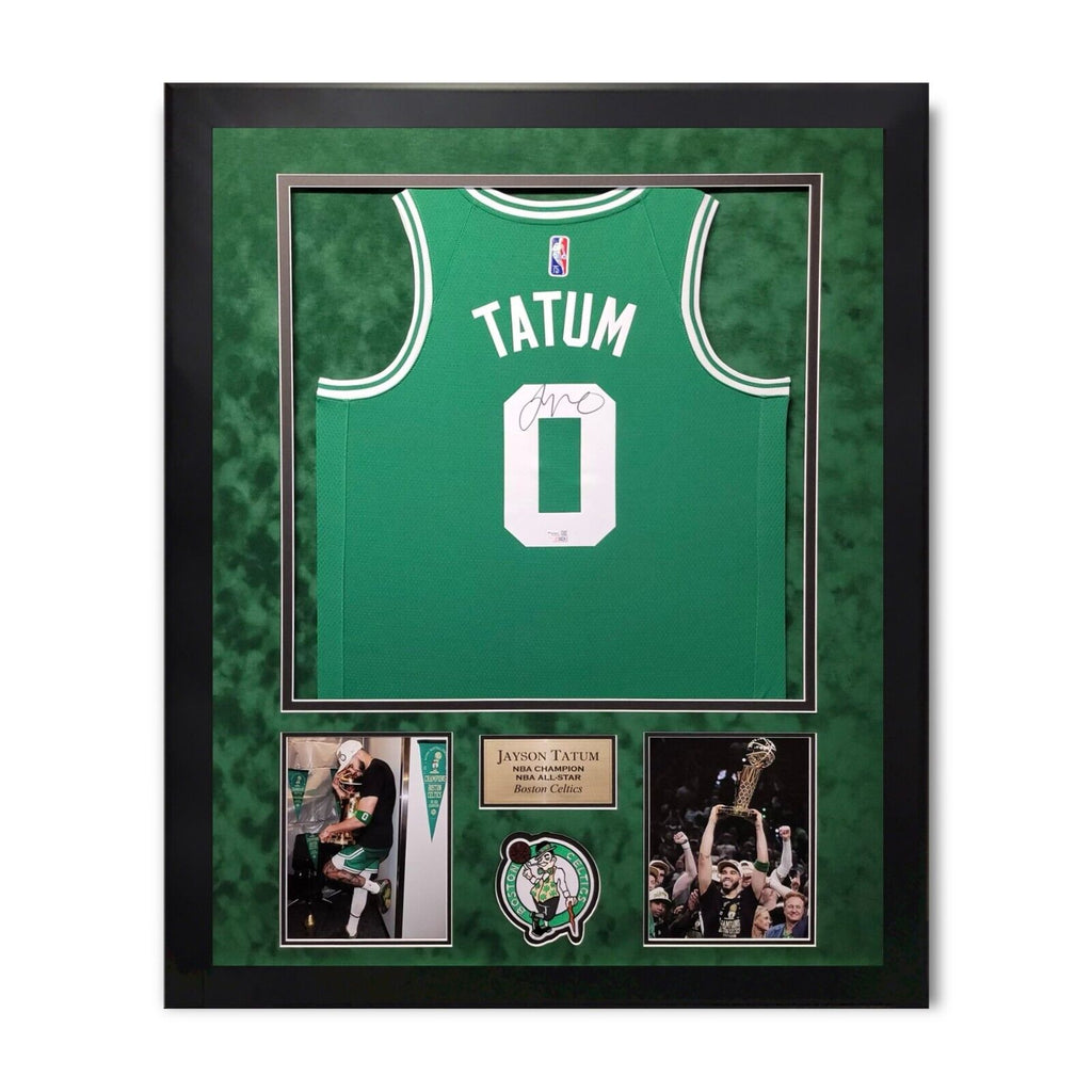 This green Nike jersey custom framed to 32x40 has been personally hand-signed by Jayson Tatum of the Boston Celtics.100% authenticCertificate of authenticity by FanaticsExact location of signature may varyasgmemorabilia.com