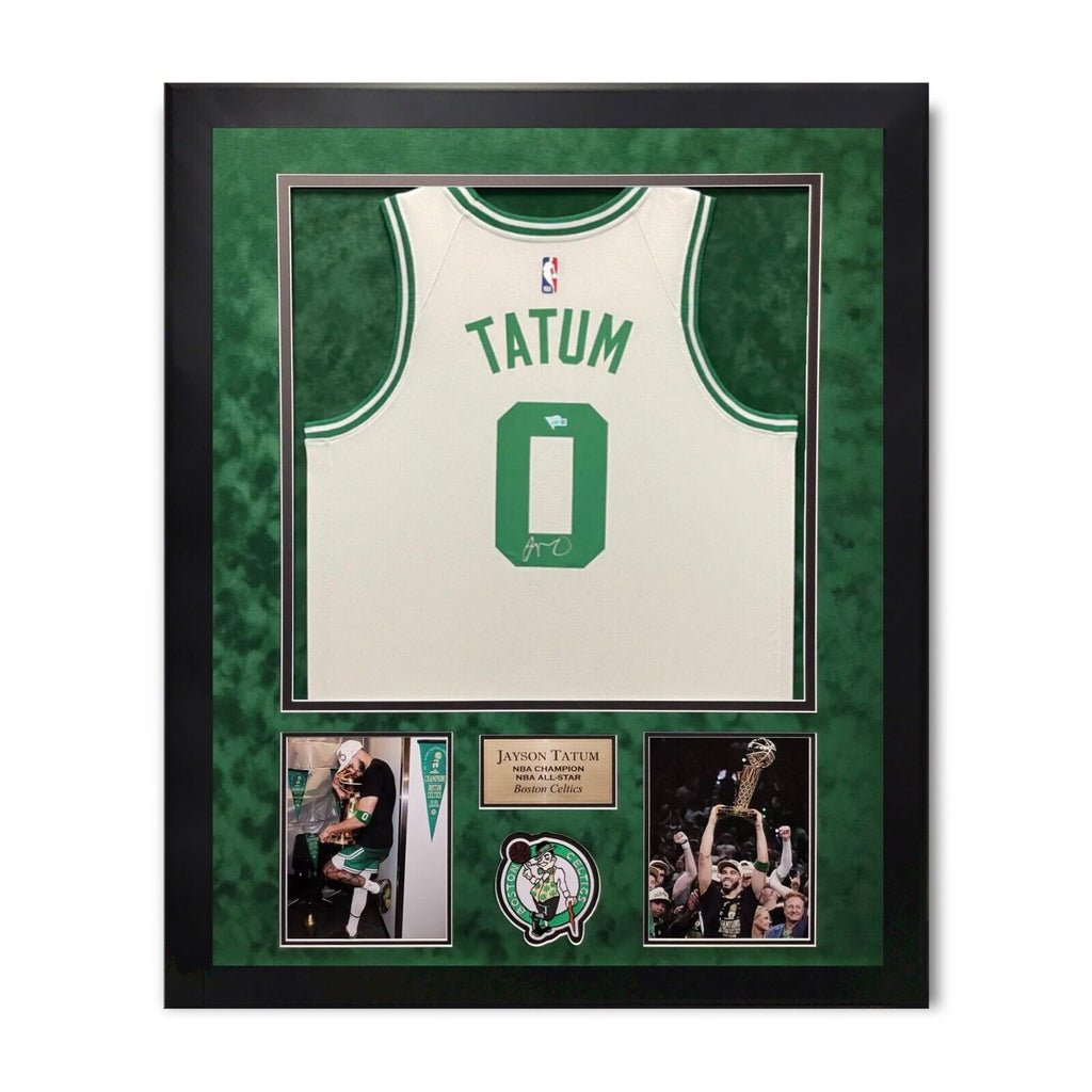 This white Nike jersey custom framed to 32x40 has been personally hand-signed by Jayson Tatum of the Boston Celtics.100% authenticCertificate of authenticity by FanaticsExact location of signature may varyasgmemorabilia.com