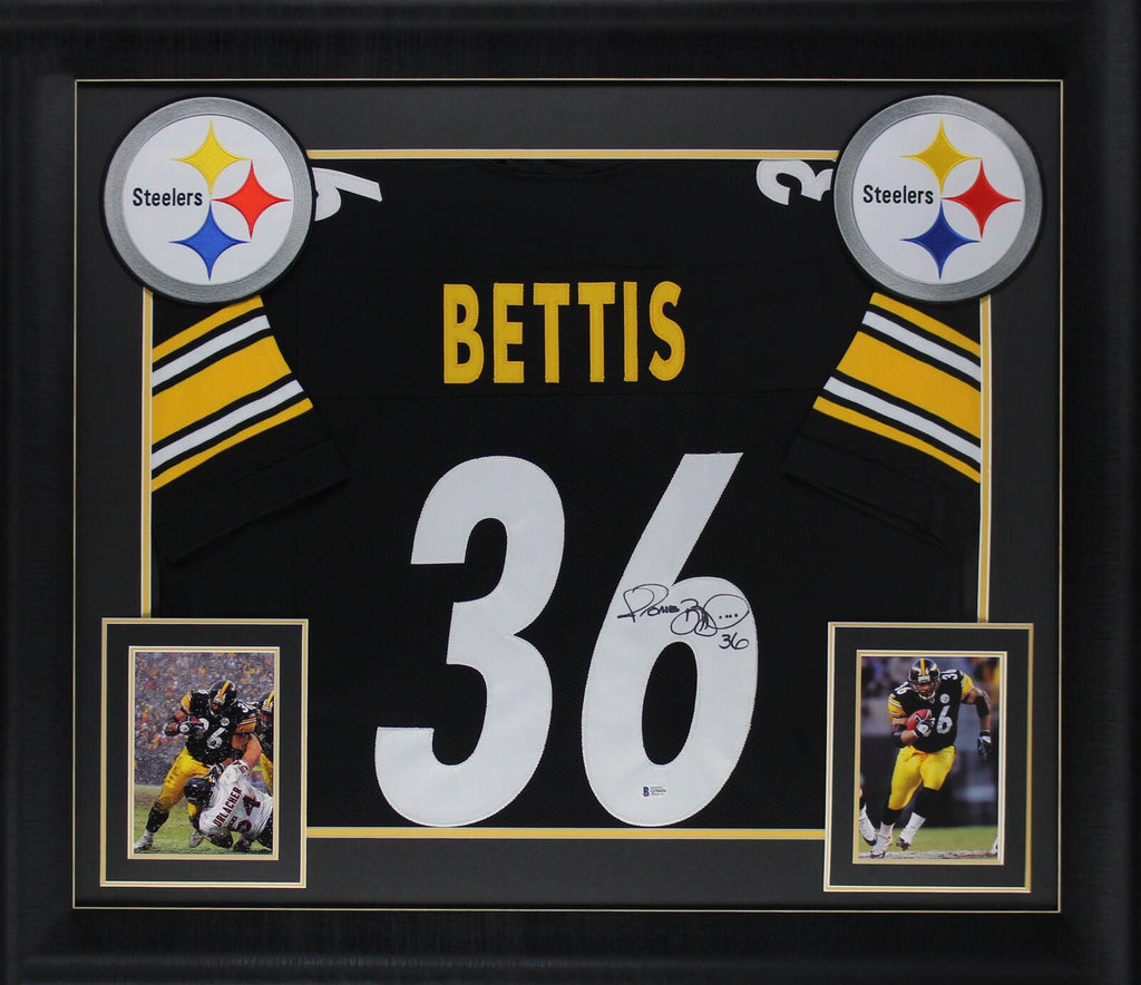 This Autographed Black Framed Jersey has been Personally Signed by Jerome Bettis of the Pittsburgh Steelers. This item is 100% Authentic to include a hologram by Beckett Authentication Services. This item will come with the new Beckett Authentication hologram that has a scannable QR code rather than the traditional COA. If you would like to have a COA, you are welcome to reach out to Beckett for a printed certification once you receive your item. This is a BAS Witnessed Protection Program item which means a Beckett Authentication Service representative was present when this item was being signed. This is a stock item. We conducted an autograph signing with Jerome Bettis and we have several of these available. The one you will receive will be of equal quality to the one pictured. This item can be verified through BAS. This is a X-Large sized, non-branded, custom-stitched Framed Jersey. This item will be professionally framed to overall dimensions of approximately 32 x 37 inches.