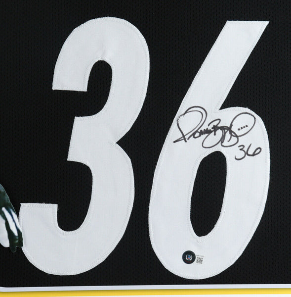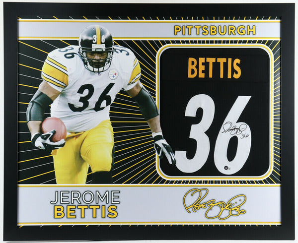 Custom frame measures approximately 35" x 43" in size and features a jersey that has been hand-signed by Jerome Bettis.The lot / autograph(s) includes an official Beckett Authentication Services serially-numbered hologram and matching COA for authenticity purposes. The signing of this item was witnessed by Beckett.Authentication: Beckett COA