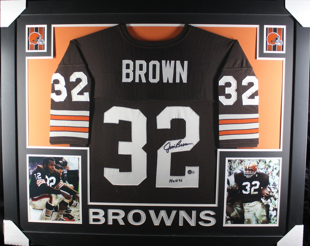Jim Brown Autographed Pro Style Framed Brown Jersey 35x43 Beckett 40121