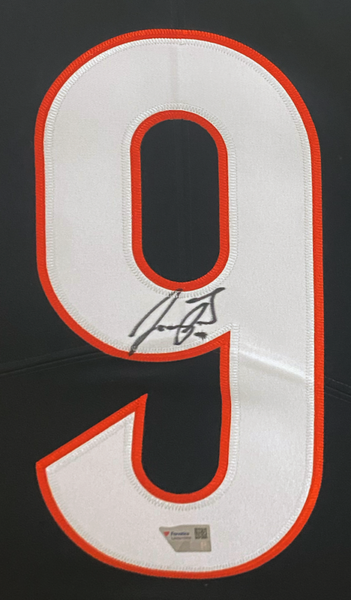This Nike Limited black jersey has been personally hand-signed by Joe Burrow. This is a showstopper. This custom framed jersey includes the highest quality materials, frame and acrylic Bengals logo. It is officially licensed by the National Football League and comes with an individually numbered, tamper-evident hologram from Fanatics Authentic. To ensure authenticity, the hologram can be reviewed online. This process helps to ensure that the product purchased is authentic and eliminates any possibility of duplication or fraud.The overall measurements of this framed jersey are 35" x 43"