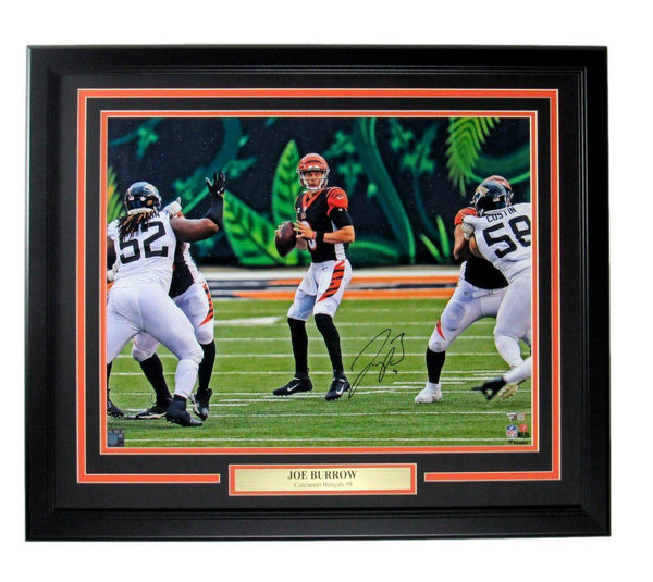 Joe Burrow Cincinnati Bengals Signed/Autographed 16x20 Photo Framed. The outer frame size is 22 inches x 26 inches. This photo is authenticated by Fanatics Authentic and includes their Tamper-proof Hologram Sticker and Certificate of Authenticity.