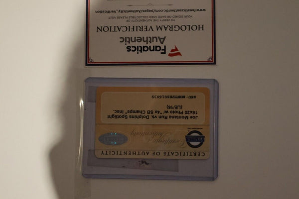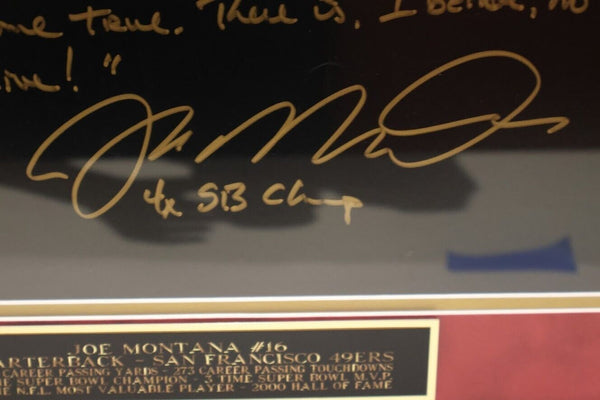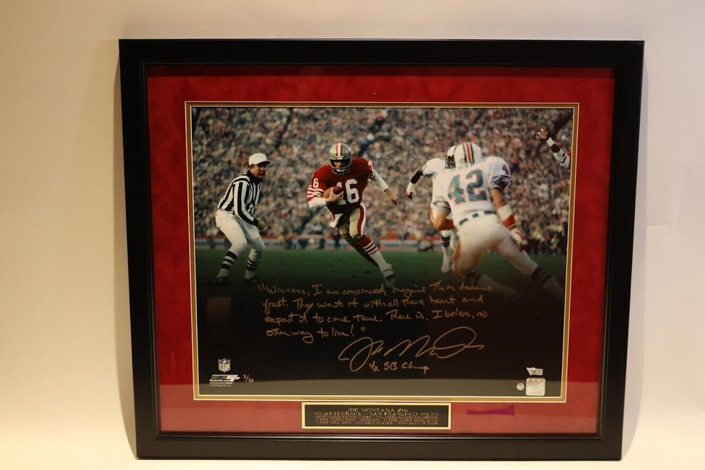 Elevate your sports memorabilia collection with this stunning 23x26 framed action photo, autographed by the legendary Joe Montana. Featuring two special inscriptions, this piece is authenticated by both Fanatics and Steiner Sports, guaranteeing its authenticity and value. Perfect for any die-hard football fan or serious collector, this framed photo captures the essence of Montana's illustrious career. Key Features: Authentic Autograph: Signed by Joe Montana, one of the greatest quarterbacks in NFL history, known for his remarkable career with the San Francisco 49ers. 2 Inscriptions: Includes two special inscriptions, adding a unique and personal touch that highlights key moments from Montana's career. Dual COA: Comes with Certificates of Authenticity from both Fanatics and Steiner Sports, two of the most trusted names in sports memorabilia authentication. High-Quality Framing: Professionally framed with premium materials, ensuring the photo is preserved and displayed beautifully. The frame features a sleek design that complements any decor. Action Shot: Features an iconic action shot of Joe Montana in the heat of the game, capturing his legendary prowess and poise on the field.
