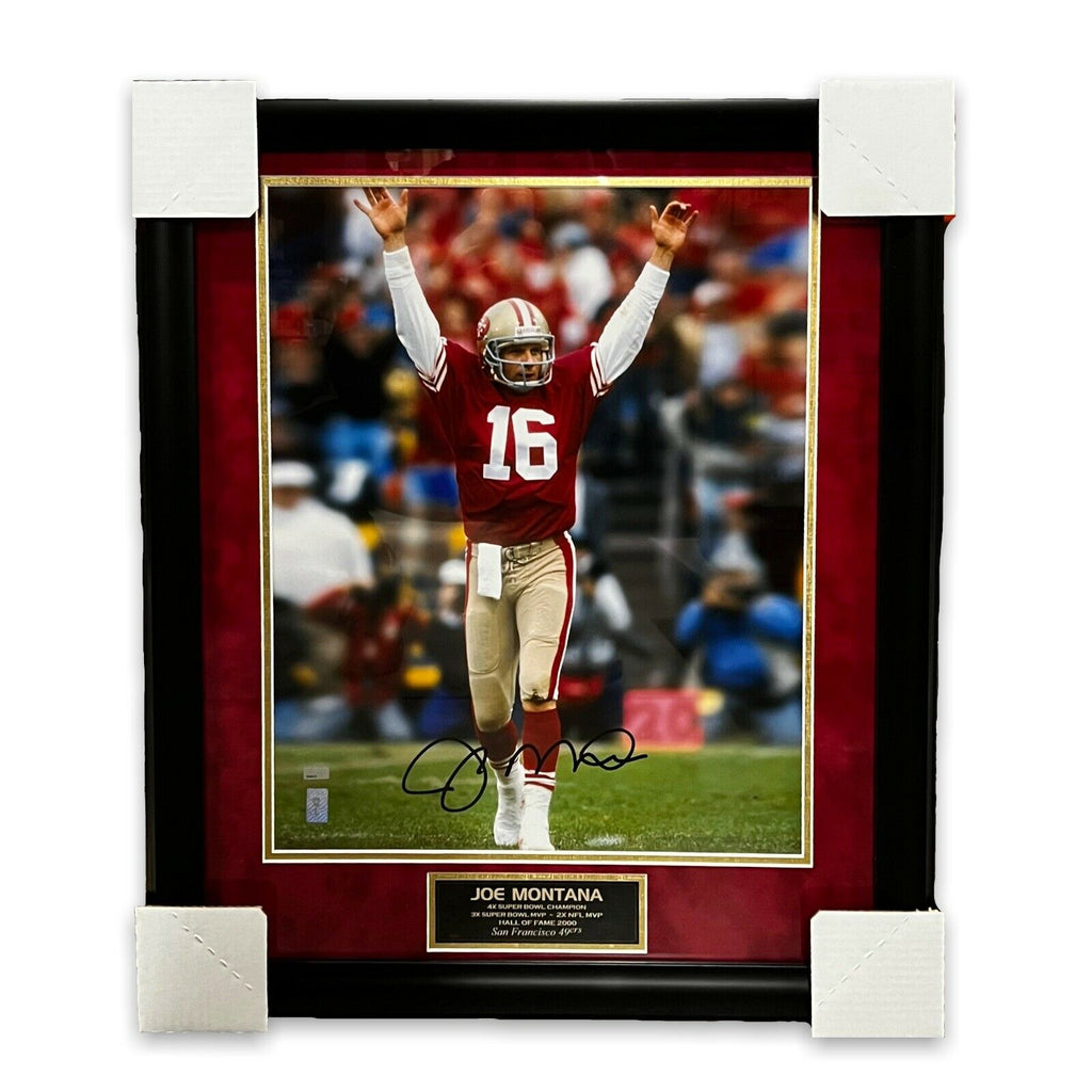This 16x20 photograph custom framed to 20x24 has been personally hand-signed by Joe Montana of the San Fransisco 49ers100% authentic Certificate of authenticity by New England Picture