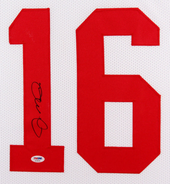 Custom frame measures approximately 34.5" x 42.5" in size. The display features a jersey that has been hand-signed in black felt-tip pen by Joe Montana (HOF). The display also includes (2) photos of Montana. The lot / autograph(s) includes an official PSA/DNA hologram and matching COA for authenticity purposes.Authentication: PSA COA
