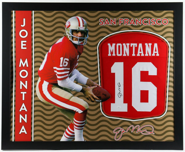 Custom frame measures 35.5" x 43.5" in size and features a jersey hand-signed by Joe Montana (HOF). The lot / autograph(s) includes an official James Spence Authentication (JSA) hologram for authenticity purposes. The signing of this item was witnessed by JSA.Authentication: JSA Hologram