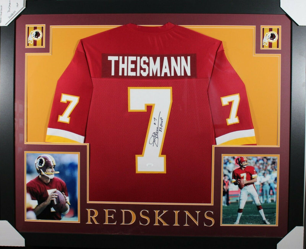 JOE THEISMANN AUTOGRAPHED & PROFESSIONALLY FRAMED PRO-STYLE JERSEY(Occasionally our own stock pictures are used at times due to quantity of framing, all frames will look identical as the one pictured)Item is accompanied with a Certificate of Authenticity issued by JSA and corresponding tamper proof hologram on the jersey.THE FRAMED JERSEY MEASURES 35"x 44" & COMES WITH THE FOLLOWING:-UV Protected Acrylic-Triple Acid Free Team Colored Matting-2 High Quality 8"x10" Photos-Team Logo
