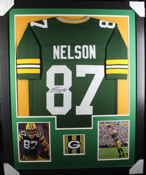 JORDY NELSON AUTOGRAPHED & PROFESSIONALLY FRAMED PRO-STYLE JERSEY(Occasionally our own stock pictures are used at times due to quantity of framing, all frames will look identical as the one pictured)THE FRAMED JERSEY MEASURES 35"x 44" & COMES WITH THE FOLLOWING:-UV Protected Acrylic-Triple Acid Free Team Colored Matting-2 High Quality 8"x10" Photos-Team LogoEvery framed autographed jersey is accompanied with a tamper-proof hologram on the signed part of the jersey from one of the main authenticators in the industry (JSA, Beckett, PSA, etc.) and can be verified on their corresponding websites to prove authenticity.ATTENTION:If there's any damage during shipping then please message us immediately and save the box!DO NOT OPEN A RETURN OR DISPUTE PLEASE!We will provide a return label to send the frame back so we can fix any issues right away and ship it right back to you, free of charge of course!WE DO NOT OFFER PARTIAL REFUNDS TO FIX LOCALLY AS EVERYTHING IS FRAMED/FIXED IN HOUSE- Thank you -