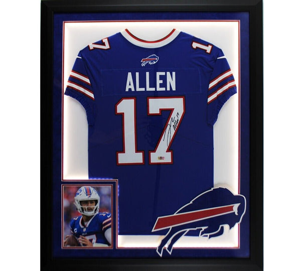 A Buffalo Bills LED Framed Nike Elite Blue Jersey hand Signed by Josh Allen. The item and signature are in excellent condition. The frame measures approximately 36''x44'' and features an 8x10 photo of Josh. Josh was drafted by the Jacksonville Jaguars in the 1st Round of the 2019 NFL Draft. He played collage football for the Kentucky Wildcats where he was awarded the Chuck Bednarik Award in 2018. AUTHENTICATION: The item is accompanied by a Radtke Sorts Certificate of Authenticity - Serial Numbered and Databased Hologram