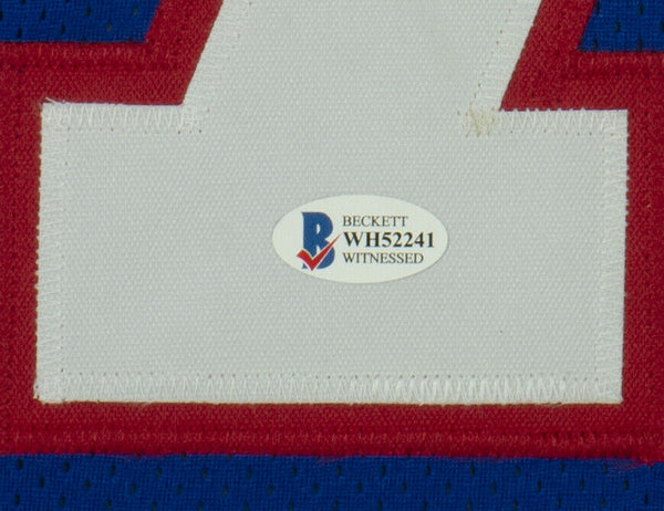 Featured is a Josh Allen Signed Framed Custom Blue Buffalo Jersey. This jersey was hand signed by Josh Allen in the presence of a BAS authentication representative. Included with the jersey is a BAS witnessed hologram and certificate of authentication. The frame of the jersey is approximately 32x36. This jersey would make a great addition to any sports memorabilia collection. This jersey has hand sewn numbers and letter and has NO logos or any affiliation with any manufacturer or team. It is simply intended as an autographed collectible.. SPECIFICATIONS Autographed By: Josh Allen Team: Buffalo Bills Sport: Football-NFL Authentication: Beckett Grading Services