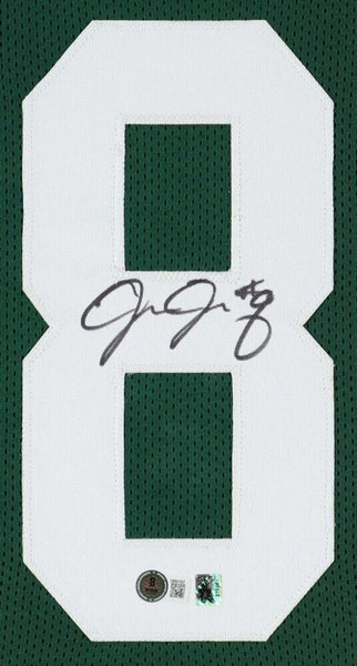 Custom frame measures approximately 35" x 43" in size and features a jersey which has been hand-signed in black felt-tip pen by Josh Jacobs. The lot / autograph(s) includes an official Beckett Authentication Services serially numbered hologram and QR Code card for authenticity purposes. The signing of this item was witnessed by BeckettAuthentication: Beckett Hologram & QR Code Card