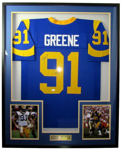 Kevin Greene HOF Los Angeles Rams Signed/Autographed Football Jersey w/ Photos Framed. This item is professionally framed using a wooden shadow box "frame" measuring 1 3/4 by 3/4 . Outside dimensions are approximately 41x33. Wire attached to easily place on your wall. Item will be securely shipped using UPS ground. Please email with any further questions. This jersey is authenticated by JSA and includes their Tamper-proof Sticker and Certificate of Authenticity.