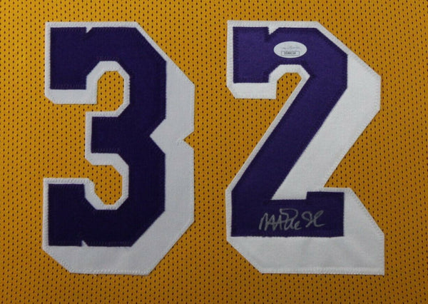MAGIC JOHNSON AUTOGRAPHED & PROFESSIONALLY FRAMED PRO-STYLE JERSEY(Occasionally our own stock pictures are used at times due to quantity of framing, all frames will look identical as the one pictured)Item is accompanied with a Certificate of Authenticity issued by JSA and corresponding tamper proof hologram on the jersey.THE FRAMED JERSEY MEASURES 35"x 44" & COMES WITH THE FOLLOWING:-UV Protected Acrylic-Triple Acid Free Team Colored Matting-2 High Quality 8"x10" Photos-Team Logo