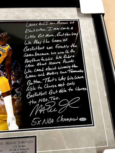 This 16x20 photograph framed has been personally hand-signed by Magic Johnson & Larry BirdMagic Johnson story inscription 100% Authentic Certificate of authenticity by Steiner asgmemorabilia.com