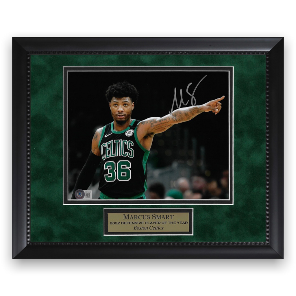 This photo custom framed to 11x14 has been personally hand signed by Marcus Smart of the Boston Celtics100% authenticCertificate of authenticity by BeckettExact location of signature may vary