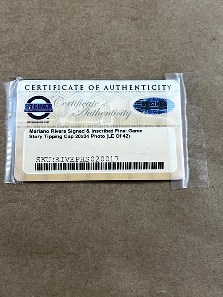 This 20x24 photograph framed has been personally hand-signed by Mariano Rivera of the New York Yankees Final game story inscription Limited edition #26/42100% Authentic Certificate of authenticity by Steiner asgmemorabilia.com