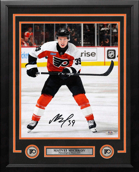 Signed photo from Flyers star Matvei Michkov; authenticated by PSA This photo has been hand-signed by the 2023 #7 overall draft pick Matvei Michkov. The autograph has been authenticated by Dynasty Sports & Framing. The photo has been signed during Matvei's first-ever public autograph signing on September 7, 2024. Hand-Signed by Flyers star Matvei MichkovSignature is bold and clear on the photoFraming is professional qualityFramed 11" x 14" measures 18" x 22"Authenticated by PSA serially-numbered hologram