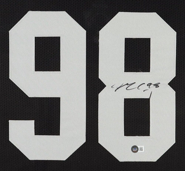Custom frame measures approximately 36" x 44" in size and features a jersey that has been hand-signed by Maxx Crosby (Las Vegas Raiders).The autograph includes an official Beckett Authentication Services serially numbered hologram for authenticity purposes. The signing of this item was witnessed by Beckett.Authentication: Beckett Hologram