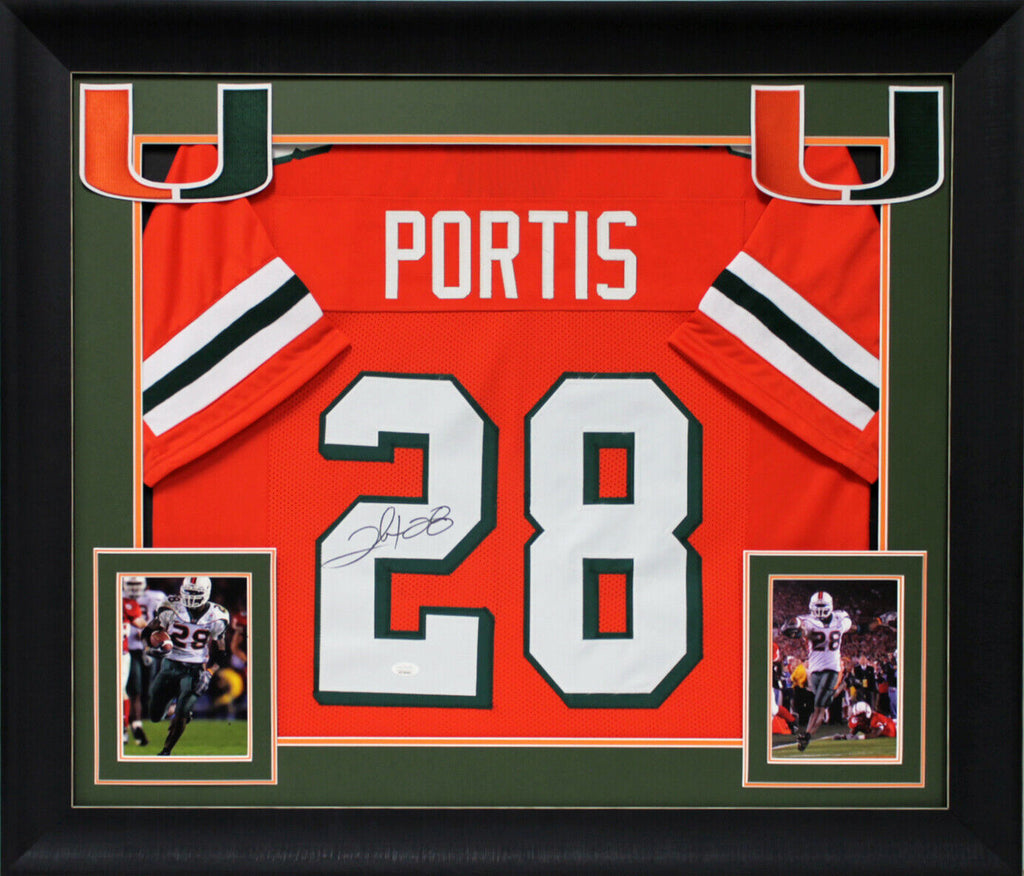 This Autographed Orange Pro Style Framed Jersey has been Personally Signed by Clinton Portis of the Miami Hurricanes. This item is 100% Authentic to include a Certificate of Authenticity (COA) / hologram by JSA Witness. This is a JSA Witnessed Protection Program item which means a JSA representative was present when this item was being signed. This is a stock item. We conducted an autograph signing with Clinton Portis and we have several of these available. The one you will receive will be of equal quality to the one pictured. This item can be verified through JSA Witness. This item has been professionally framed to overall dimensions of approximately 32 x 37 inches. This is a X-Large sized, non-branded, custom-stitched Framed Jersey. These jerseys are framed to order, it takes approximately 3-4 business days for framing to be completed.
