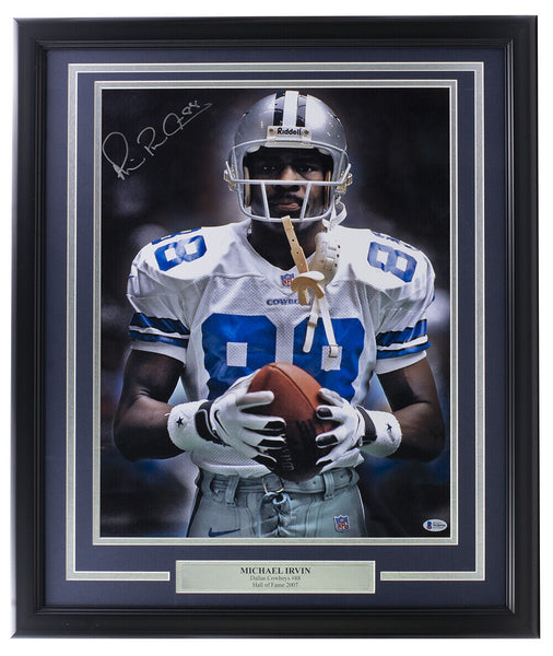 Featured is a Michael Irvin signed framed 16x20 Dallas Cowboys football photo. This photo was hand signed by Michael Irvin and has been authenticated by Beckett authentication services. Included with the photo is a Beckett hologram and certificate of authenticity. This photo has been professionally framed and matted and measures approximately 22x27. SPECIFICATIONS Autographed By: Michael Irvin Team: Dallas Cowboys Sport: Football Authentication: Beckett Grading Services
