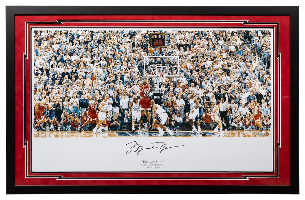 Game 6 of the 1998 nba finals was played on june 14th, at the delta center between the chicago bulls and the utah jazz. with the game on the line, both teams knew the ball would end up in michael jordan's hands.the jazz's best perimeter defender, byron russell had the daunting task of trying to stop the league's greatest player. with the clock dwindling down, jordan crossed over russell and hit a 20-foot jump shot to give the bulls an 87-86 lead with 5.2 seconds left. the clutch shot gave the bulls an 87-86 victory and their 6th championship in 8 years.jordan finished the game with 45 points on his way to earning his 6th finals most valuable player award. it would be michael jordan's final shot in a bulls uniform. this 36"x22" michael jordan autographed picture captures number 23's last shot as a chicago bull. the overall dimensions of this framed lithograph are 42.25" x 27.25"jordan's autograph has been authenticated by virtue of uda's five-step authentication process. this piece is a replica art print of world renowned memorabilia artist chuck gillies original commissioned painting of michael jordan's last shot vs the utah jazz in the 1998 nba finals. money back guarantee! if for any reason you are not completely satisfied with the quality or authenticity of your purchase, we will gladly give you a full refund or exchange, whichever you prefer up to 30 days after purchase. please feel free to e-mail us with any questions. good luck bidding!!! authenticator pre-certified authenticator: upper deck authenticated history of item: michael jordan signed this item in the presence of a representative from upper deck authenticated. describe how you came to possess this item: super sports center is a fully authorized dealer for upper deck authenticated as well as mounted memories and steiner sports. other information about you and / or the item: super sports center strives to deliver the most authentic in sports memorabilia from trusted companies like mounted memories, steiner sports and upper deck authenticated. if it exists, we can find it for you!