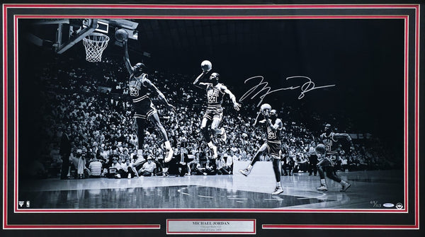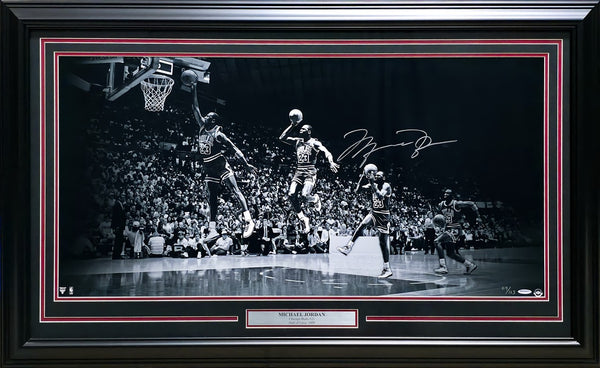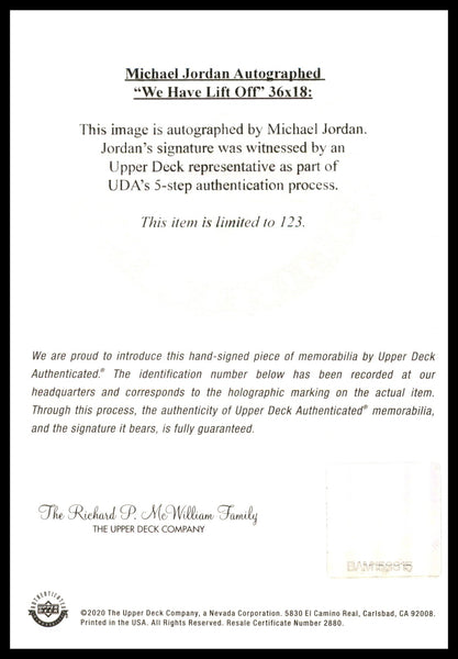 This is a Framed 18x36 'We Have Lift Off' Photo, approximately 27x44 with the frame, that has been hand signed by Michael Jordan. This is a limited edition item that has been serial numbered #69/123. This item has been certified authentic by Upper Deck Authentication (UDA) and comes with their tamper-proof hologram and matching full-page certificate of authenticity.