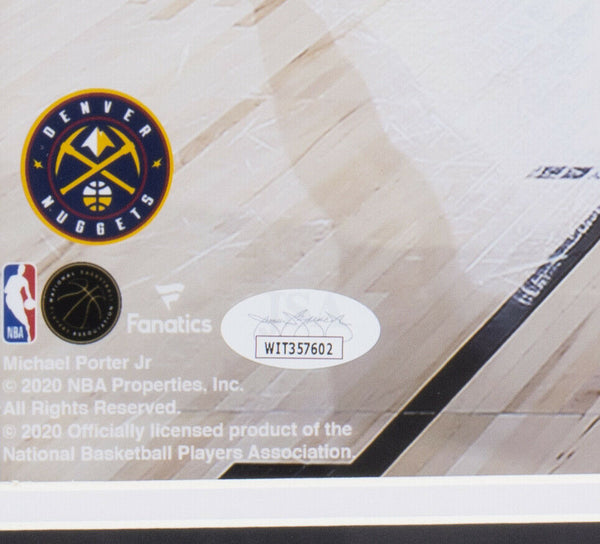 Featured is a Michael Porter Jr. signed framed 16x20 Denver Nuggets photo. This photo was hand signed by Michael Porter Jr. in the presence of a JSA authentication representative. Included with the photo is a JSA witnessed hologram and certificate of authentication. Brand new professional framing featuring double matting, engraved nameplate. The frame measures approximately 22x27 in total size and it is ready for display. This item would make a great addition to any sports memorabilia collection.. SPECIFICATIONS Autographed By: Michael Porter Jr. Team: Denver Nuggets Sport: Basketball Authentication: James Spence Authentication (JSA)