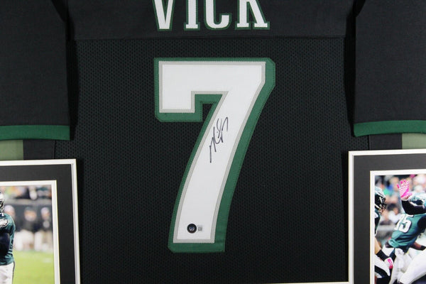 MICHAEL VICK AUTOGRAPHED & PROFESSIONALLY FRAMED PRO-STYLE JERSEY(Occasionally our own stock pictures are used at times due to quantity of framing, all frames will look identical as the one pictured)THE FRAMED JERSEY MEASURES 35"x 44" & COMES WITH THE FOLLOWING:-UV Protected Acrylic-Triple Acid Free Team Colored Matting-2 High Quality 8"x10" Photos-Team LogoEvery framed autographed jersey is accompanied with a tamper-proof hologram on the signed part of the jersey from one of the main authenticators in the industry (JSA, Beckett, PSA, etc.) and can be verified on their corresponding websites to prove authenticity.ATTENTION:If there's any damage during shipping then please message us immediately and save the box!DO NOT OPEN A RETURN OR DISPUTE PLEASE!We will provide a return label to send the frame back so we can fix any issues right away and ship it right back to you, free of charge of course!WE DO NOT OFFER PARTIAL REFUNDS TO FIX LOCALLY AS EVERYTHING IS FRAMED/FIXED IN HOUSE- Thank you -