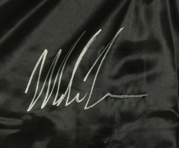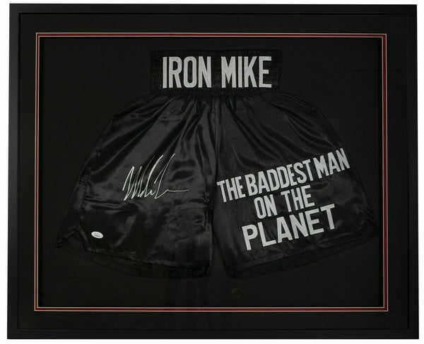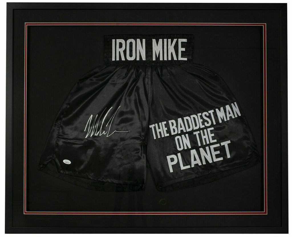 Featured are Mike Tyson signed framed black baddest man on the planet boxing trunks. These trunks were hand signed by Mike Tyson in the presence of a JSA authentication representative. Included with the trunks is a JSA witnessed hologram and certificate of authentication. Brand new professional framing featuring double matting, and engraved nameplate. The frame measures approximately 32x36 in total size and it is ready for display. This photo would make a great addition to any sports memorabilia collection.. SPECIFICATIONS Autographed By: Team: Sport: Boxing Authentication: James Spence Authentication (JSA)