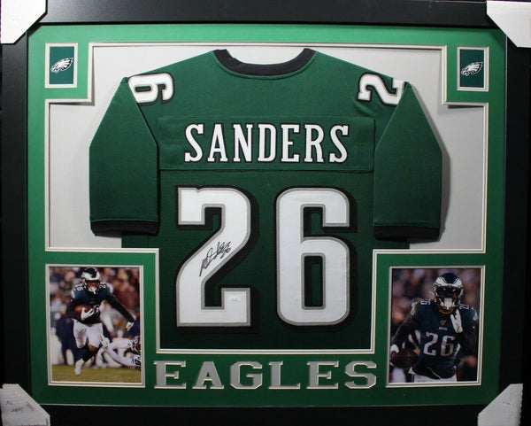 MILES SANDERS AUTOGRAPHED & PROFESSIONALLY FRAMED PRO-STYLE JERSEY(Occasionally our own stock pictures are used at times due to quantity of framing, all frames will look identical as the one pictured)THE FRAMED JERSEY MEASURES 35"x 44" & COMES WITH THE FOLLOWING:-UV Protected Acrylic-Triple Acid Free Team Colored Matting-2 High Quality 8"x10" Photos-Team LogoEvery framed autographed jersey is accompanied with a tamper-proof hologram on the signed part of the jersey from one of the main authenticators in the industry (JSA, Beckett, PSA, etc.) and can be verified on their corresponding websites to prove authenticity.