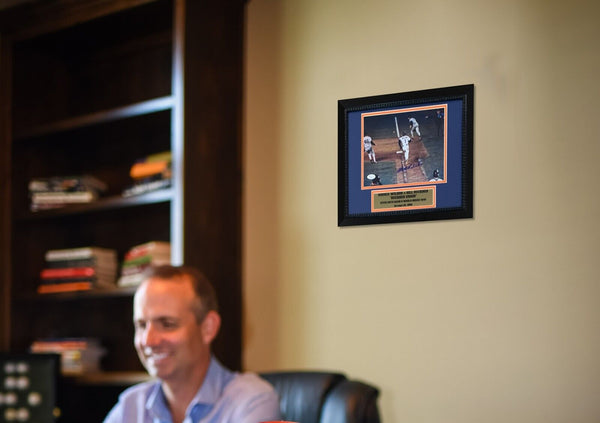 Mookie Wilson has autographed this famous photo of the Bill Buckner error in game 6 of the 1986 World Series which lead to the Mets win of that game and ultimately the series in game 7. Autograph is authenticated by JSA (James Spence Authentication) the world's leading authenticator of sports autographs. Comes with their unique sticker # fixed to the item and verified on their website. Also comes with their certificate of authenticity with same matching #. Black frame measures 16x16 and comes ready to hang.