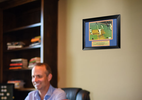 This framed display features Mookie Wilsons autograph on both an official baseball and 8x10 photo capturing the legendary Bill Buckner error from the 1986 World Series. Authenticated by PSA DNA COA this piece commemorates one of the most iconic moments in baseball history. Wilson also wrote "86 WSC it gets through Buckner." A perfect addition to any Mets or baseball memorabilia collection this item is ideal for display and tells the story of a championship-defining play. Add this exceptional collectible to your lineup today. Frame measures 13x16 and comes ready to hang.