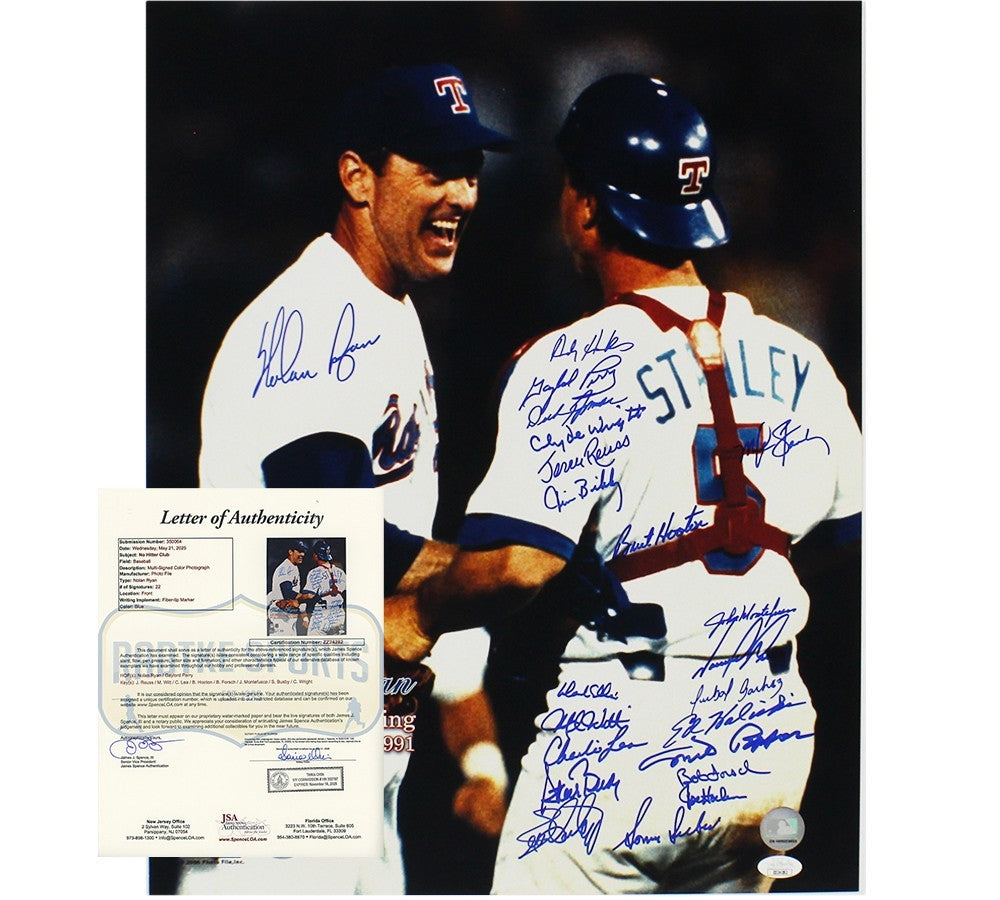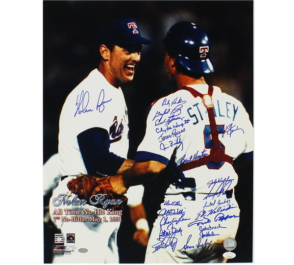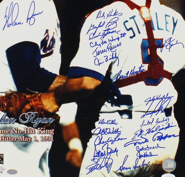 A Texas Rangers Unframed 16x20 Nolan Ryan All Time No-Hit King MLB Photo hand signed by 22 No Hitter Club including Nolan Ryan, Gaylord Perry, Charlie Lea, Mike Witt, Burt Hooton, Bob Forsch, John Montefusco, Steve Busby, Clyde Wright. AUTHENTICATION: The item is accompanied by a JSA Letter of Authenticity - JSA Serial Numbered and Databased Hologram